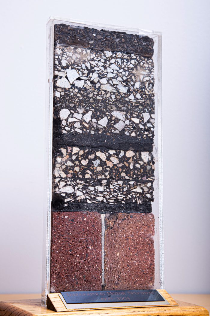 Below the bricks, there are four inches of sand, a double seal coat and a bituminous macadam layer. This exploration yielded a new acquisition for the IMS. A sample of the original pavement structure is now on display at the Indianapolis Motor Speedway Museum for the first time.